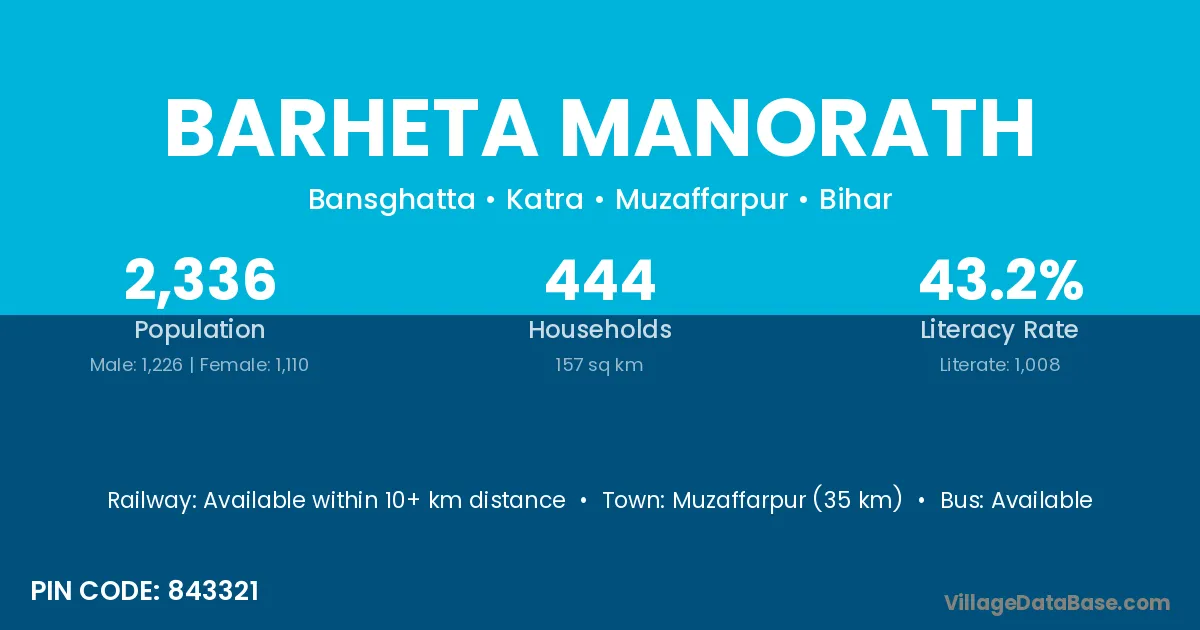 Muzaffarpur (35 km) is the nearest town to Barheta Manorath village for major economic activities and is located approximately 35 km away.