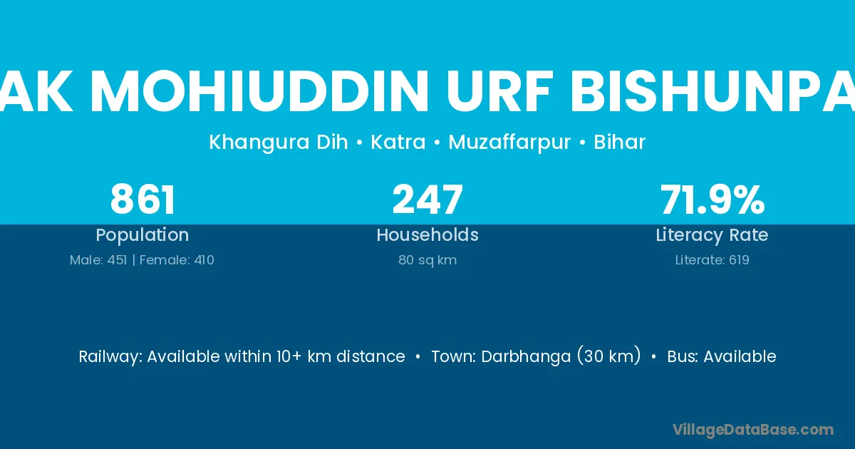 Darbhanga (30 km) is the nearest town to Chak Mohiuddin Urf Bishunpatti village for major economic activities and is located approximately 30 km away.