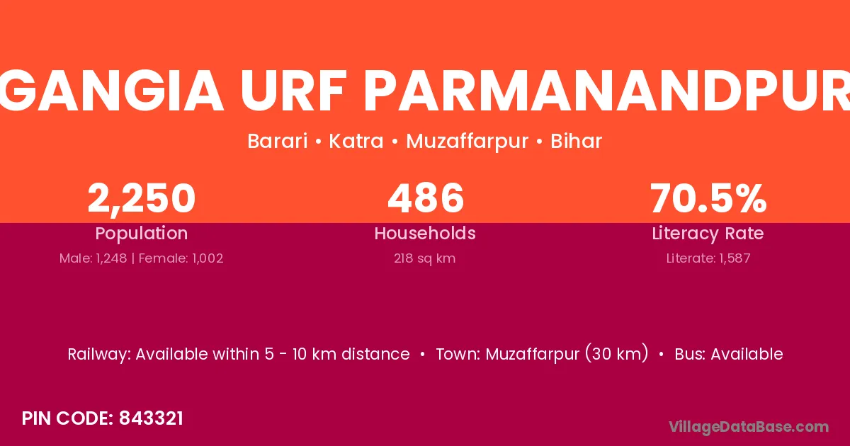 Gangia Urf Parmanandpur village has a total population of 2,250 people, of which 1,248 are males and 1,002 are females.