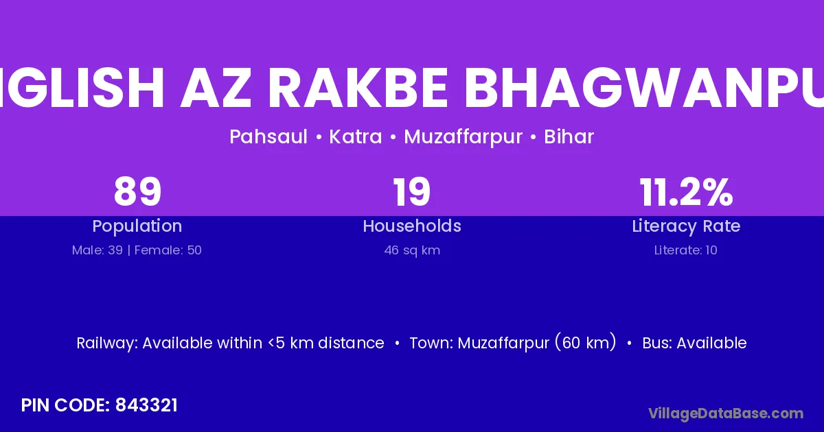 Inglish Az Rakbe Bhagwanpur village has a total population of 89 people, of which 39 are males and 50 are females.