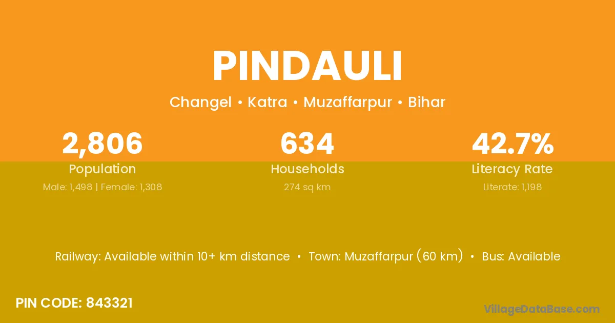 Muzaffarpur (60 km) is the nearest town to Pindauli village for major economic activities and is located approximately 60 km away.