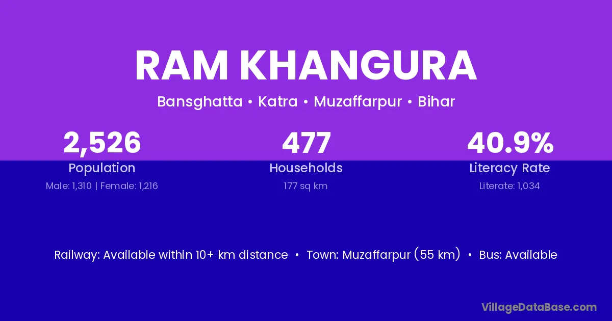 Muzaffarpur (55 km) is the nearest town to Ram Khangura village for major economic activities and is located approximately 55 km away.