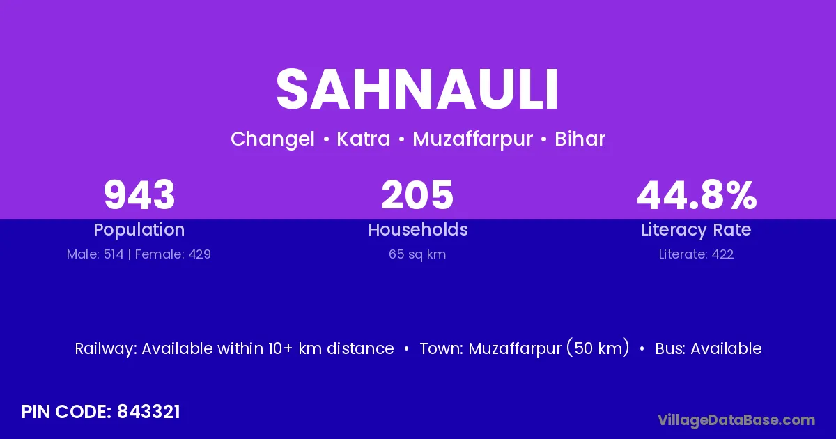 Muzaffarpur (50 km) is the nearest town to Sahnauli village for major economic activities and is located approximately 50 km away.