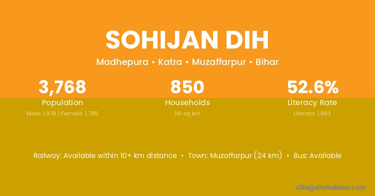 Muzaffarpur (24 km) is the nearest town to Sohijan Dih village for major economic activities and is located approximately 24 km away.