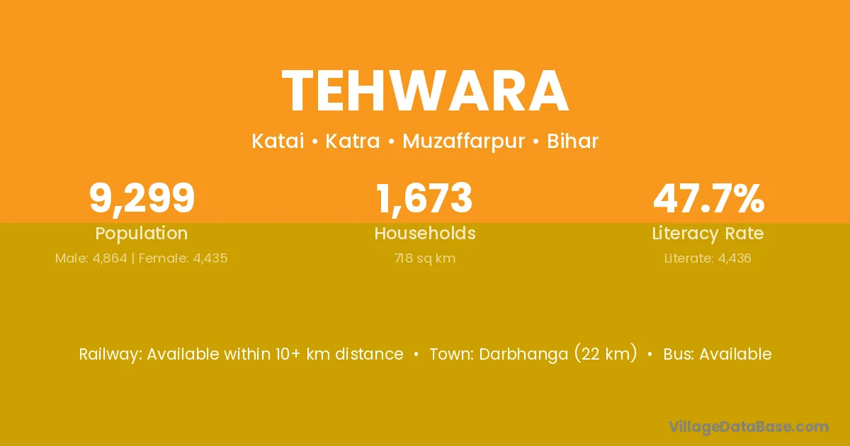 Darbhanga (22 km) is the nearest town to Tehwara village for major economic activities and is located approximately 22 km away.
