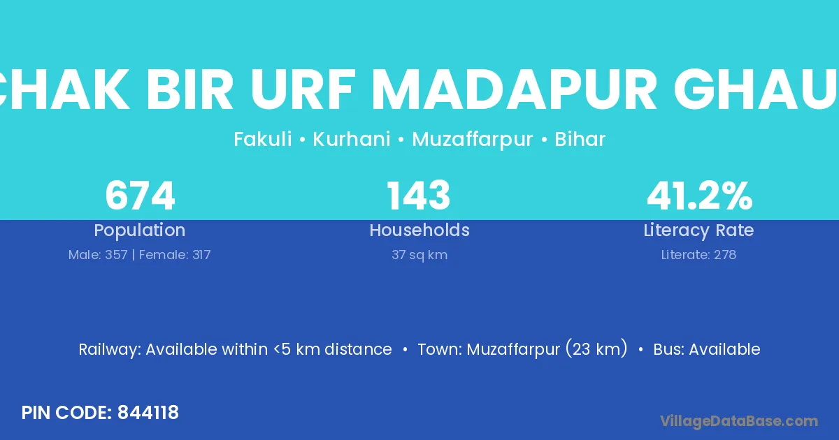 Muzaffarpur (23 km) is the nearest town to Chak Bir Urf Madapur Ghaus village for major economic activities and is located approximately 23 km away.