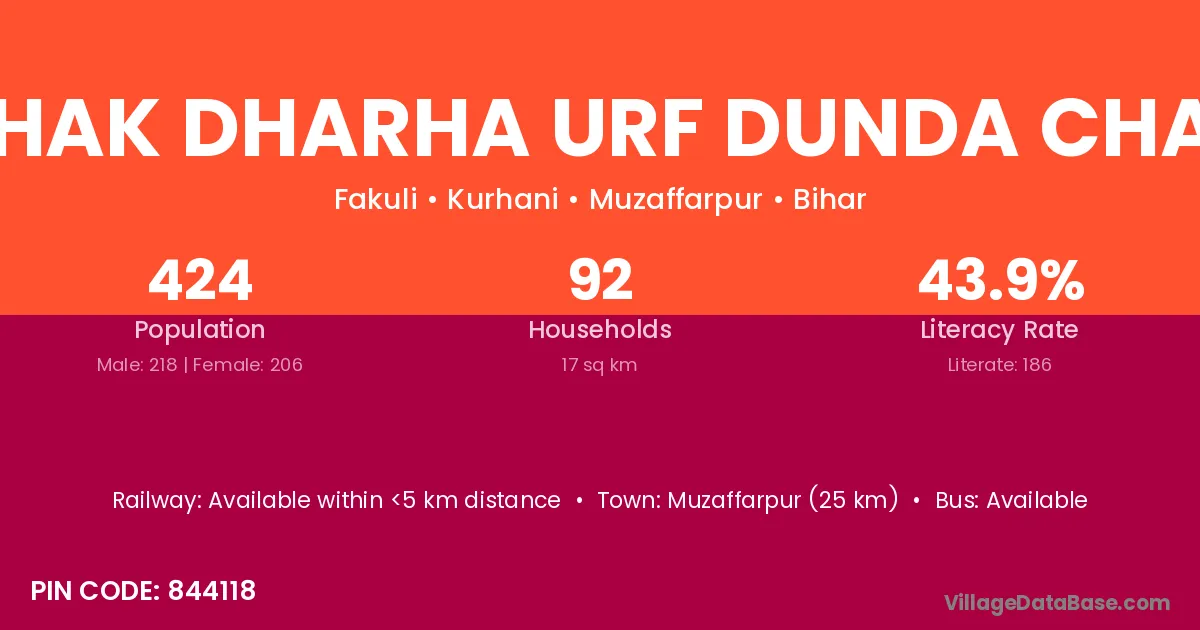 Chak Dharha Urf Dunda Chak village has a total population of 424 people, of which 218 are males and 206 are females.