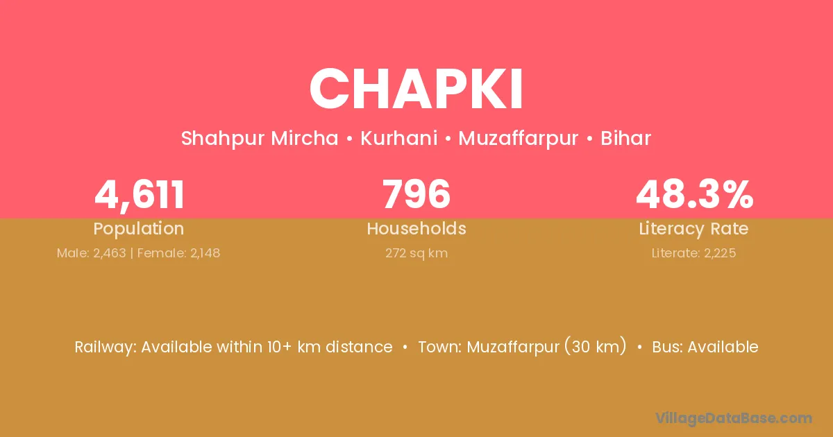 Muzaffarpur (30 km) is the nearest town to Chapki village for major economic activities and is located approximately 30 km away.