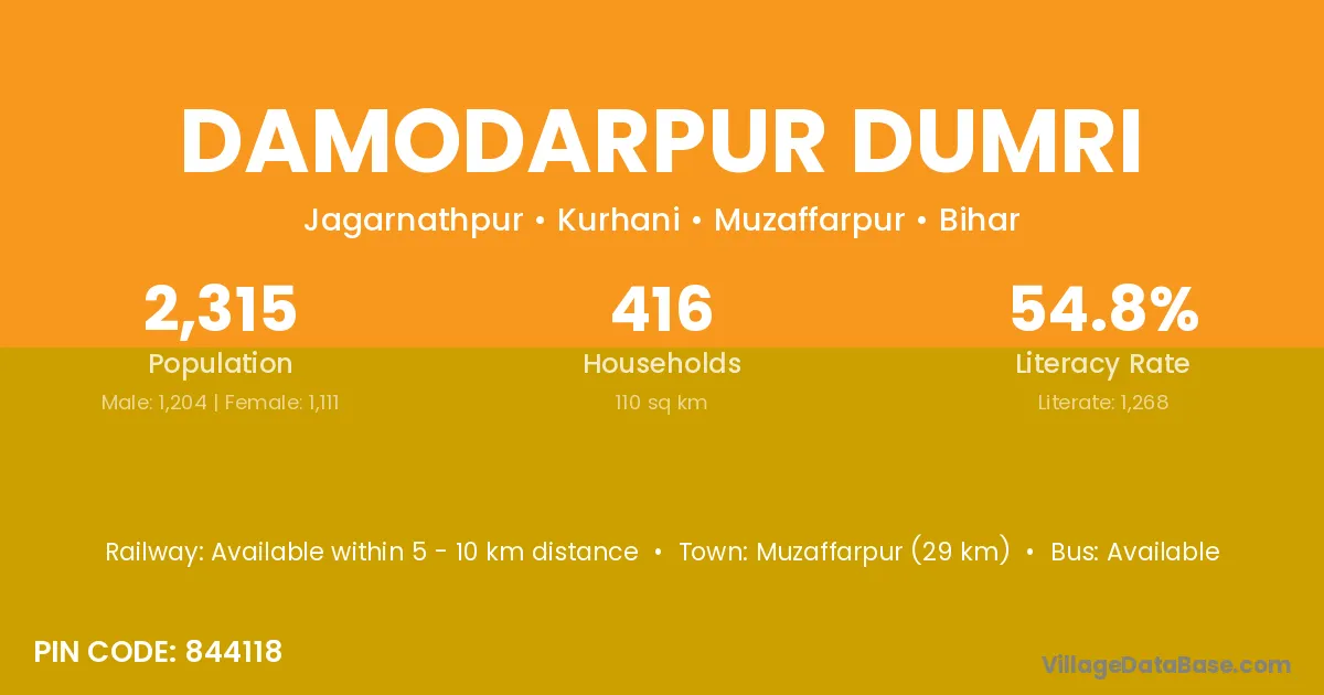 Damodarpur Dumri village has a total population of 2,315 people, of which 1,204 are males and 1,111 are females.