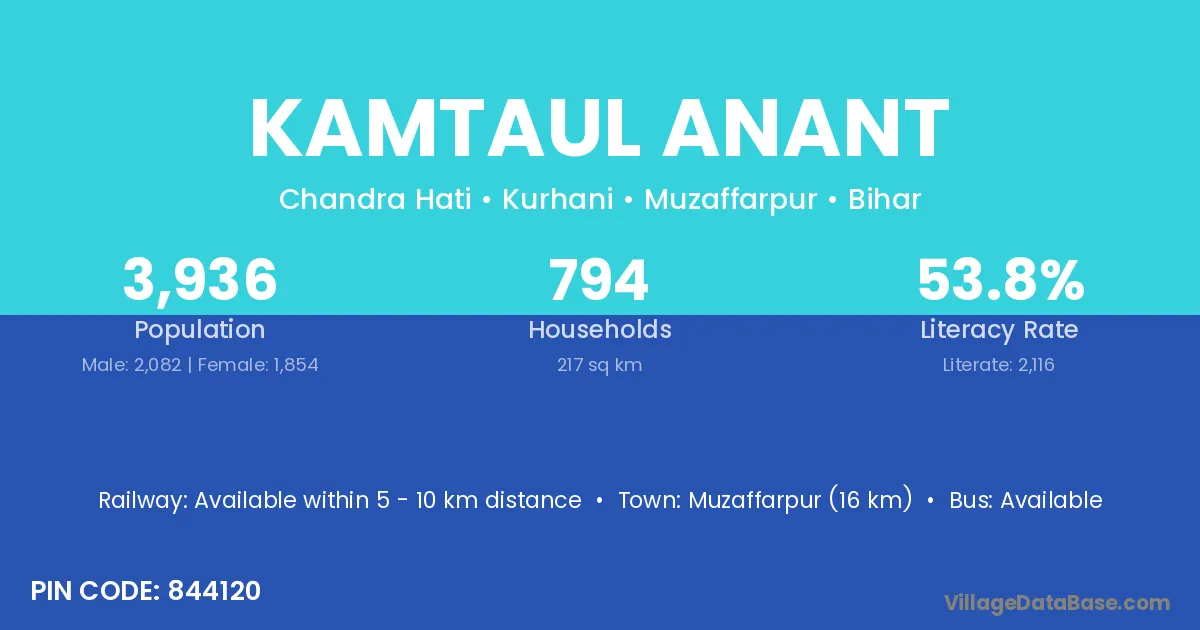 Muzaffarpur (16 km) is the nearest town to Kamtaul Anant village for major economic activities and is located approximately 16 km away.