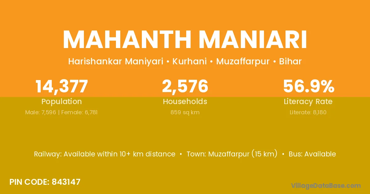 Muzaffarpur (15 km) is the nearest town to Mahanth Maniari village for major economic activities and is located approximately 15 km away.