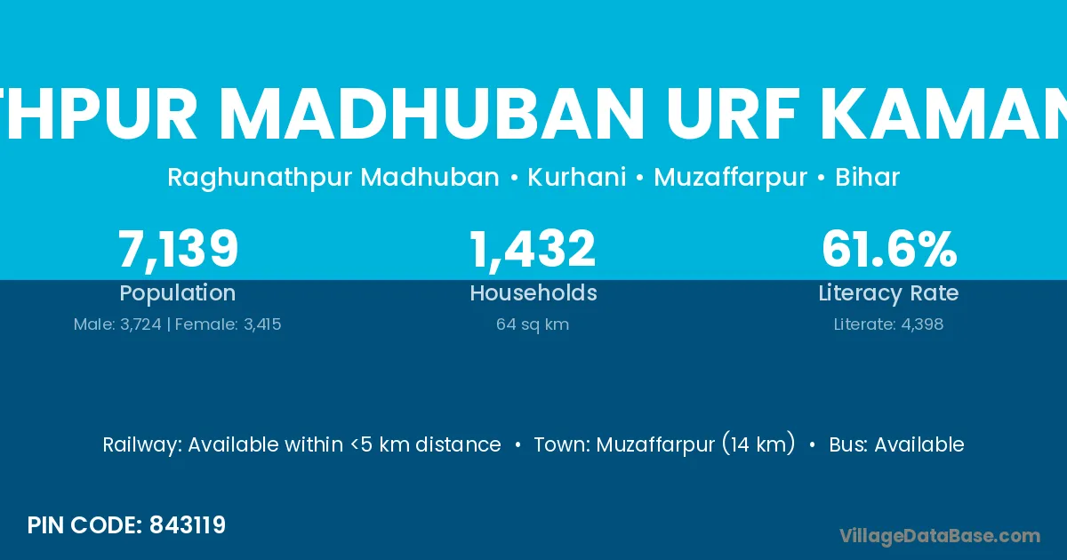 Muzaffarpur (14 km) is the nearest town to Raghunathpur Madhuban Urf Kaman Chhapra village for major economic activities and is located approximately 14 km away.