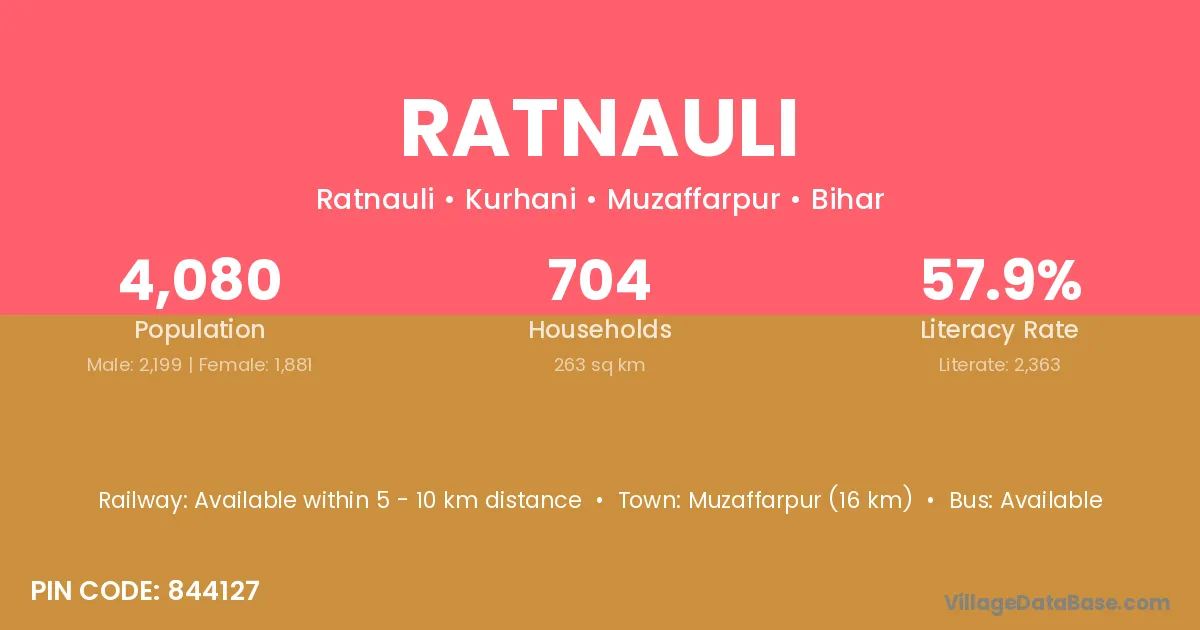 Muzaffarpur (16 km) is the nearest town to Ratnauli village for major economic activities and is located approximately 16 km away.