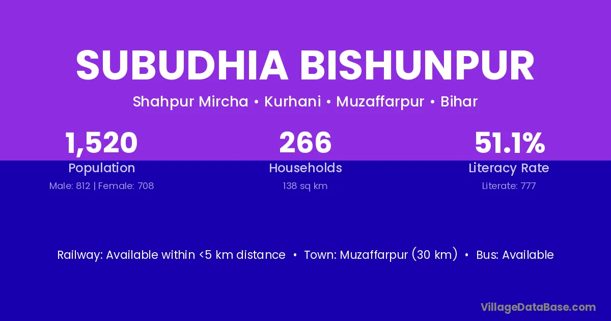 Muzaffarpur (30 km) is the nearest town to Subudhia Bishunpur village for major economic activities and is located approximately 30 km away.