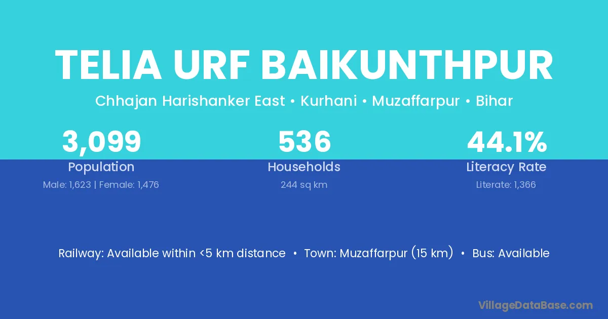Muzaffarpur (15 km) is the nearest town to Telia Urf Baikunthpur village for major economic activities and is located approximately 15 km away.