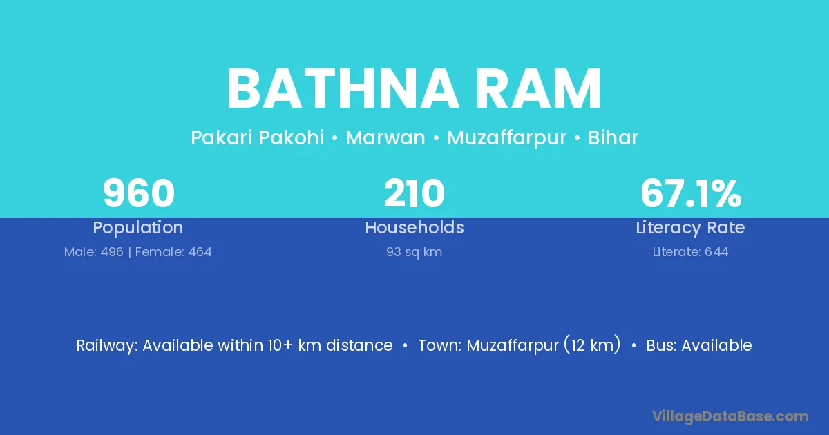 Muzaffarpur (12 km) is the nearest town to Bathna Ram village for major economic activities and is located approximately 12 km away.