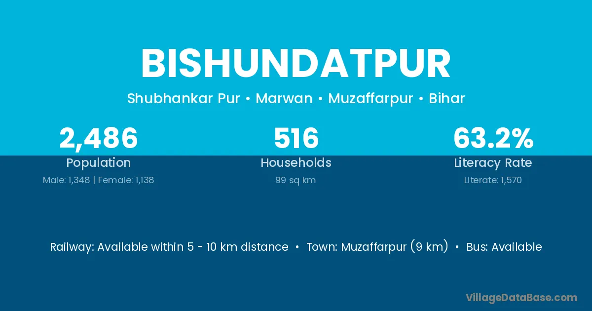 Muzaffarpur (9 km) is the nearest town to Bishundatpur village for major economic activities and is located approximately 9 km away.