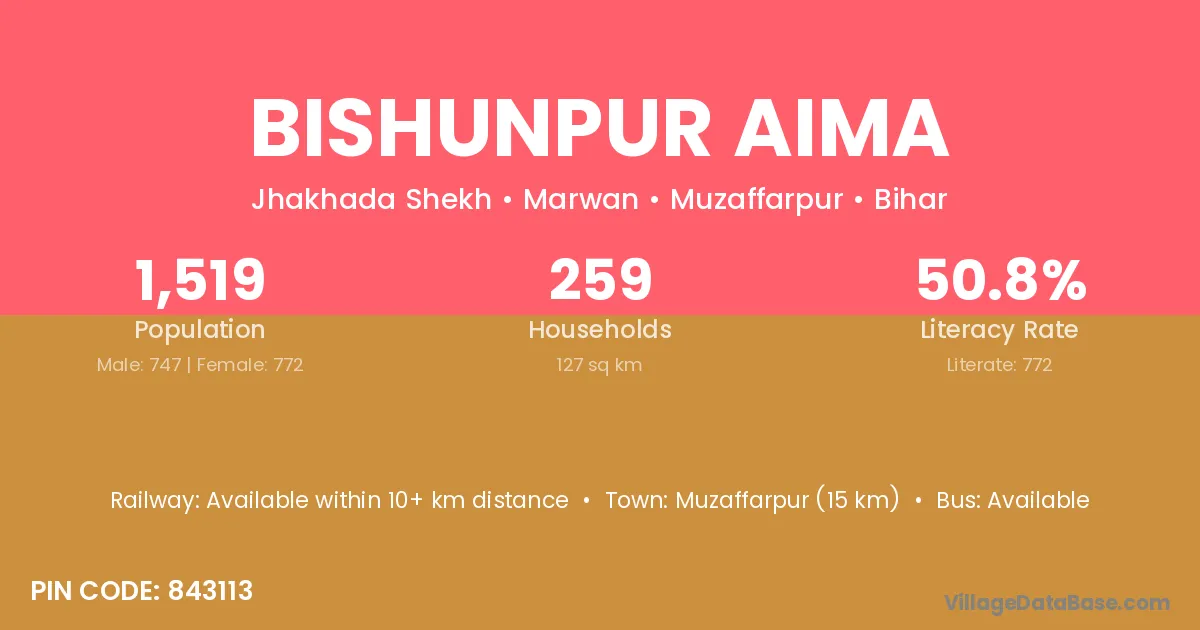 Muzaffarpur (15 km) is the nearest town to Bishunpur Aima village for major economic activities and is located approximately 15 km away.