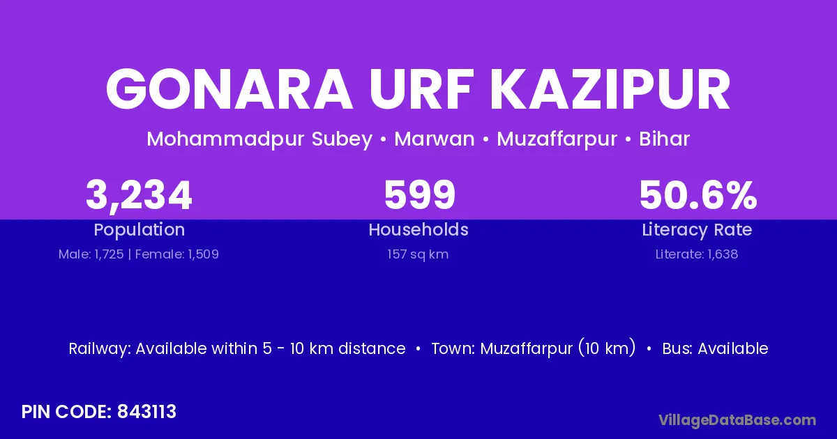 Muzaffarpur (10 km) is the nearest town to Gonara Urf Kazipur village for major economic activities and is located approximately 10 km away.