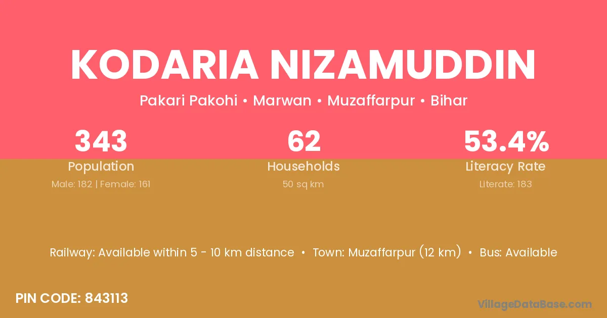 Muzaffarpur (12 km) is the nearest town to Kodaria Nizamuddin village for major economic activities and is located approximately 12 km away.