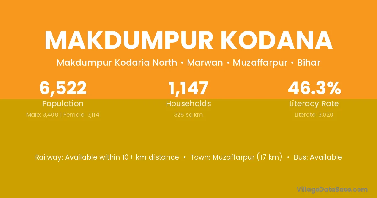 Muzaffarpur (17 km) is the nearest town to Makdumpur Kodana village for major economic activities and is located approximately 17 km away.