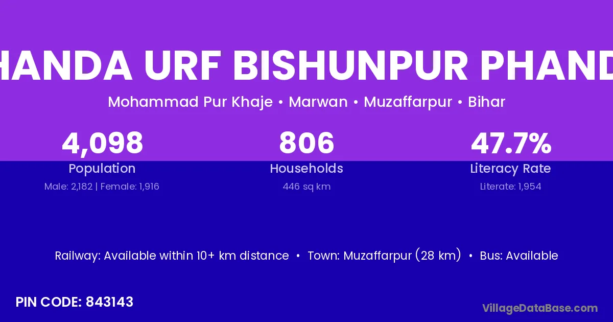 Phanda Urf Bishunpur Phanda village has a total population of 4,098 people, of which 2,182 are males and 1,916 are females.