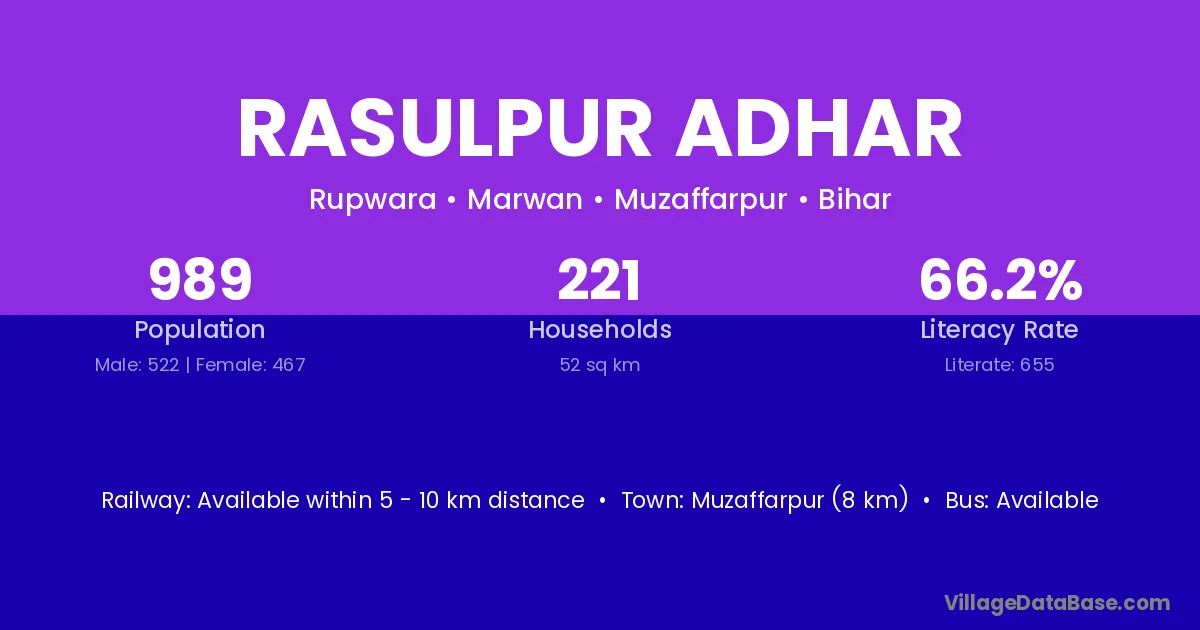 Muzaffarpur (8 km) is the nearest town to Rasulpur Adhar village for major economic activities and is located approximately 8 km away.