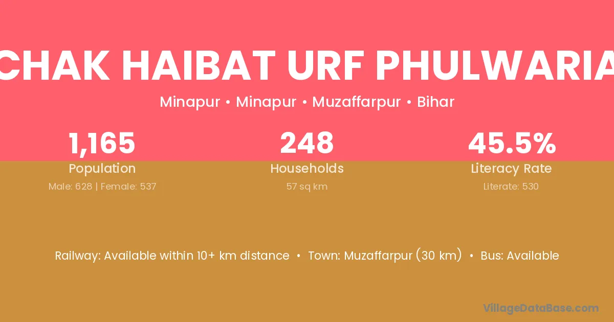 Muzaffarpur (30 km) is the nearest town to Chak Haibat Urf Phulwaria village for major economic activities and is located approximately 30 km away.