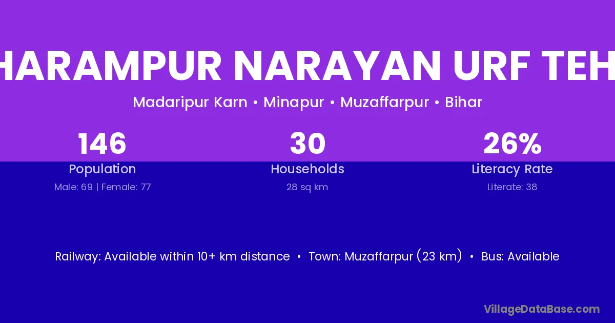 Dharampur Narayan Urf Tehai village has a total population of 146 people, of which 69 are males and 77 are females.