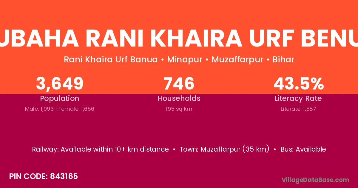 Dubaha Rani Khaira Urf Benua village has a total population of 3,649 people, of which 1,993 are males and 1,656 are females.