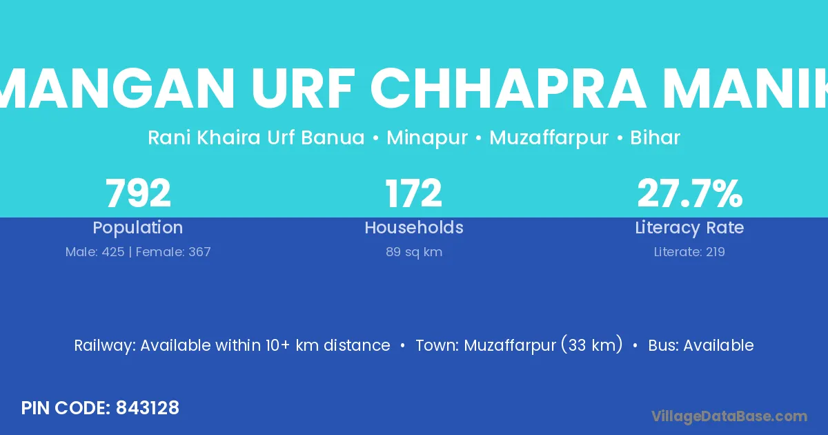 Mangan Urf Chhapra Manik village has a total population of 792 people, of which 425 are males and 367 are females.