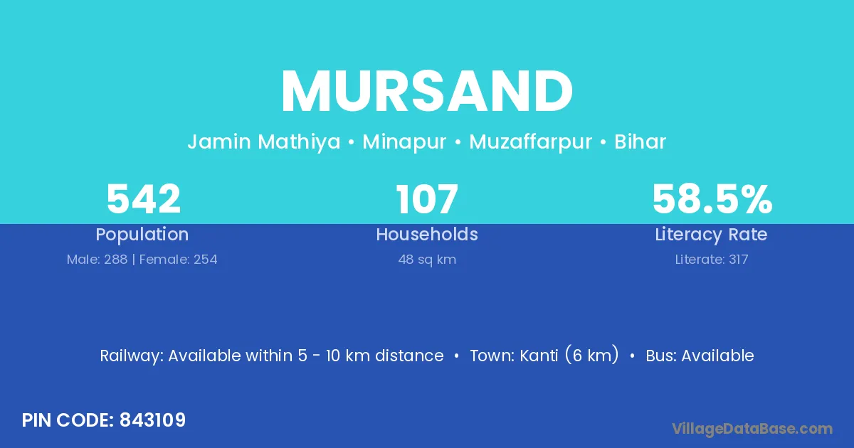 Kanti (6 km) is the nearest town to Mursand village for major economic activities and is located approximately 6 km away.