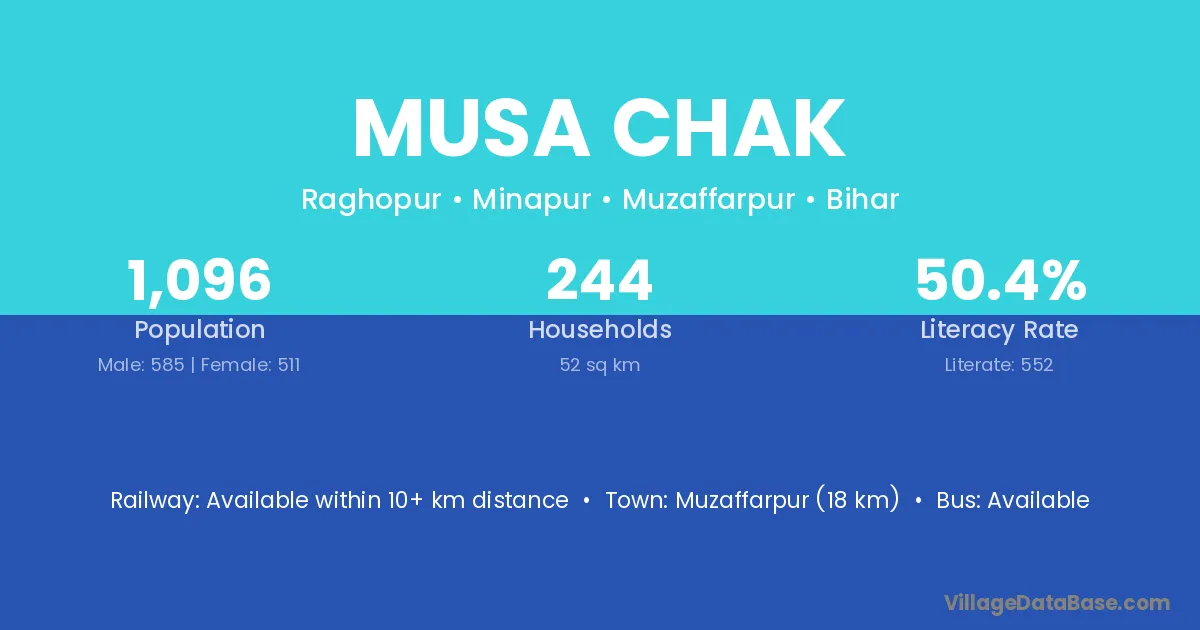 Muzaffarpur (18 km) is the nearest town to Musa Chak village for major economic activities and is located approximately 18 km away.