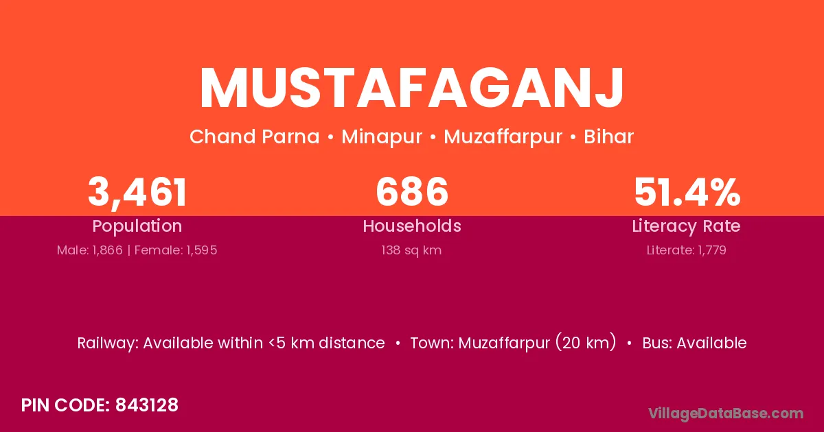 Mustafaganj village has a total population of 3,461 people, of which 1,866 are males and 1,595 are females.