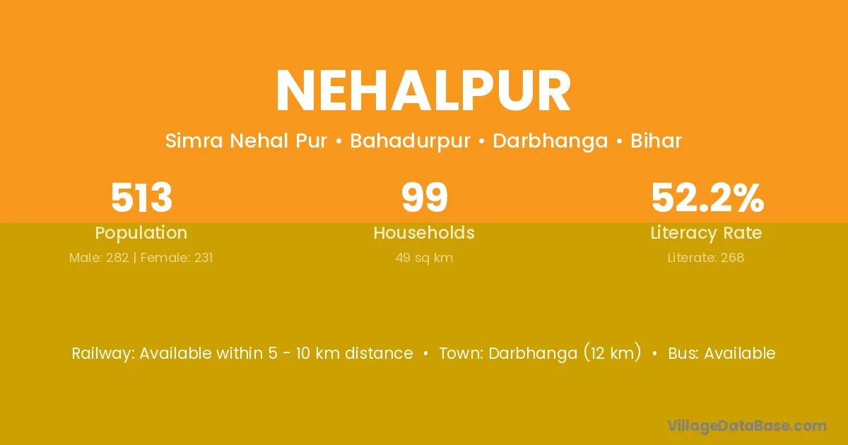 Muzaffarpur (20 km) is the nearest town to Nehalpur village for major economic activities and is located approximately 20 km away.