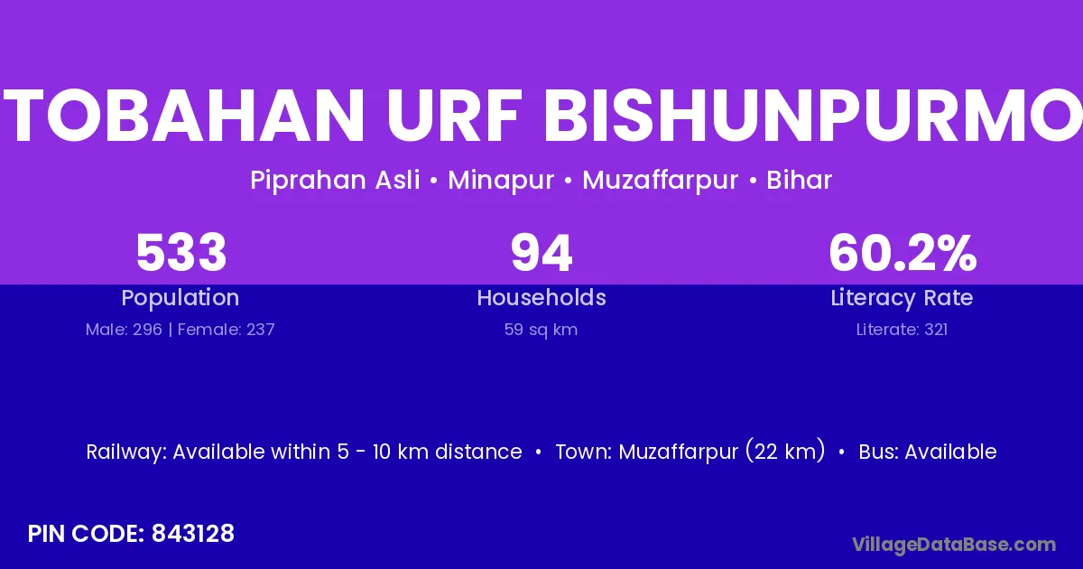 Ramtobahan Urf Bishunpurmohan village has a total population of 533 people, of which 296 are males and 237 are females.
