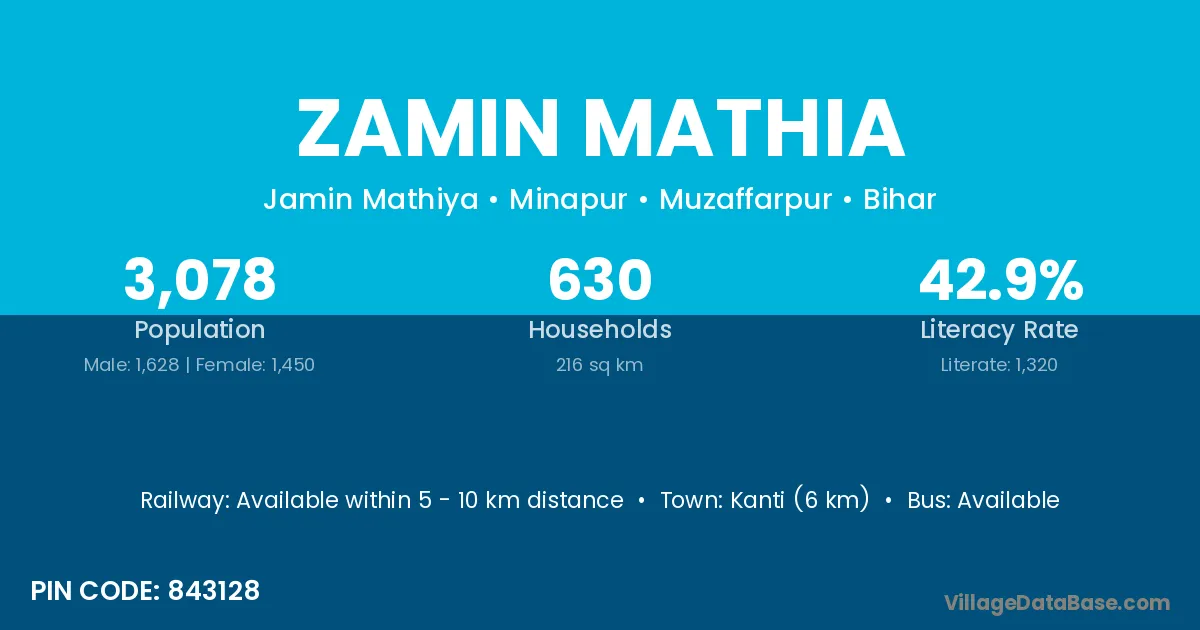 Kanti (6 km) is the nearest town to Zamin Mathia village for major economic activities and is located approximately 6 km away.