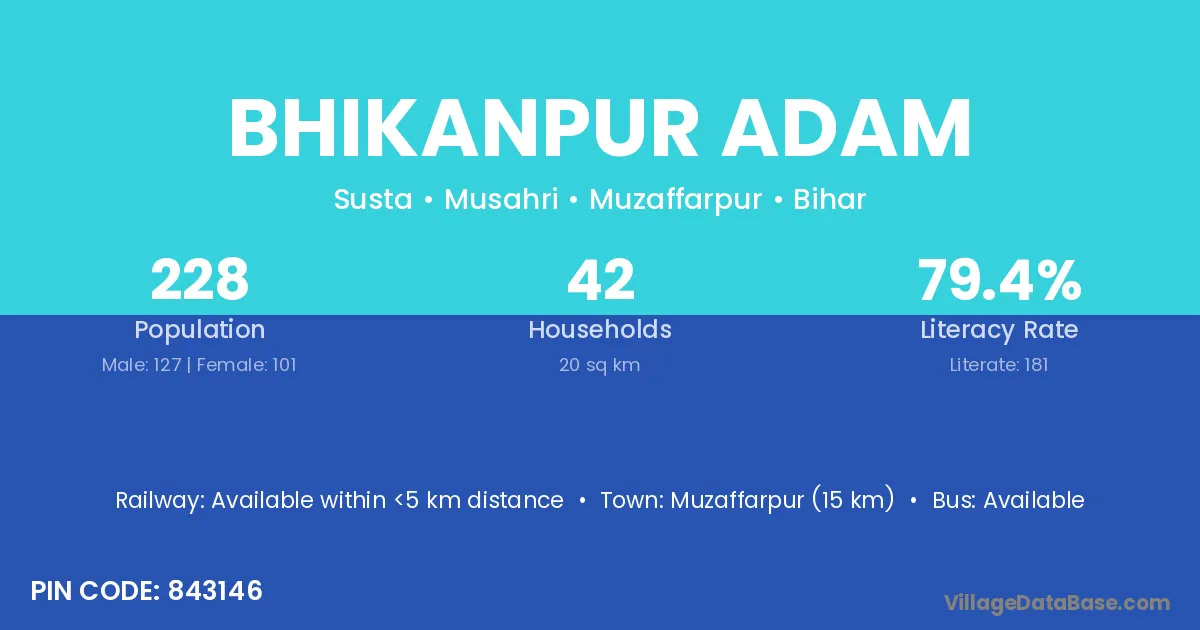 Muzaffarpur (15 km) is the nearest town to Bhikanpur Adam village for major economic activities and is located approximately 15 km away.
