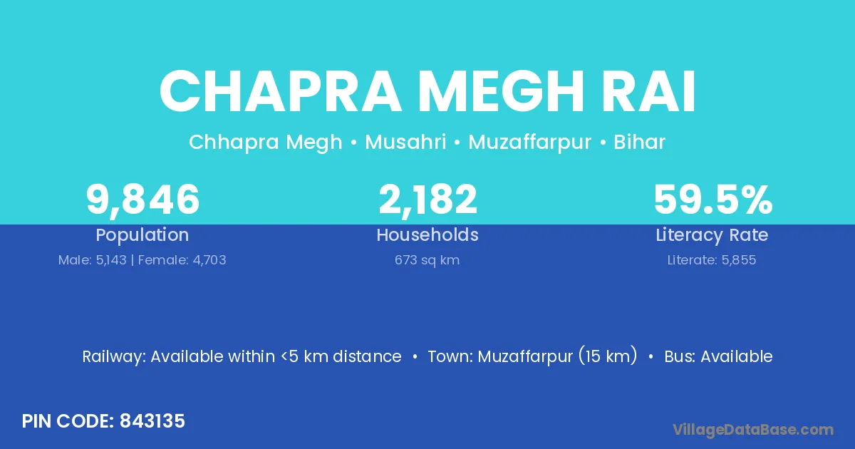 Muzaffarpur (15 km) is the nearest town to Chapra Megh Rai village for major economic activities and is located approximately 15 km away.
