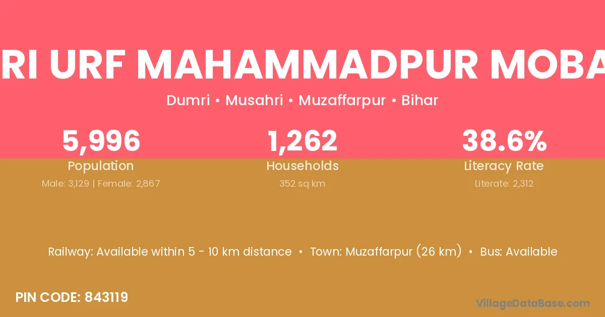 Dumri Urf Mahammadpur Mobarak village has a total population of 5,996 people, of which 3,129 are males and 2,867 are females.