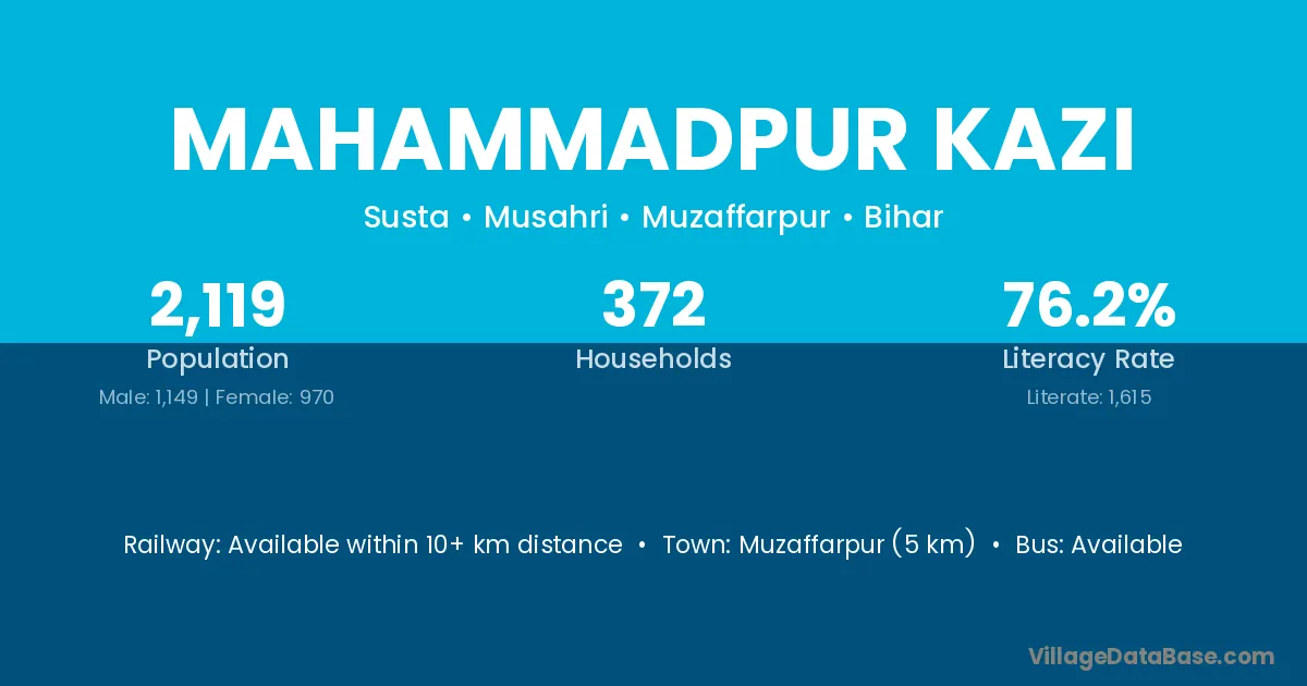 Muzaffarpur (5 km) is the nearest town to Mahammadpur Kazi village for major economic activities and is located approximately 5 km away.