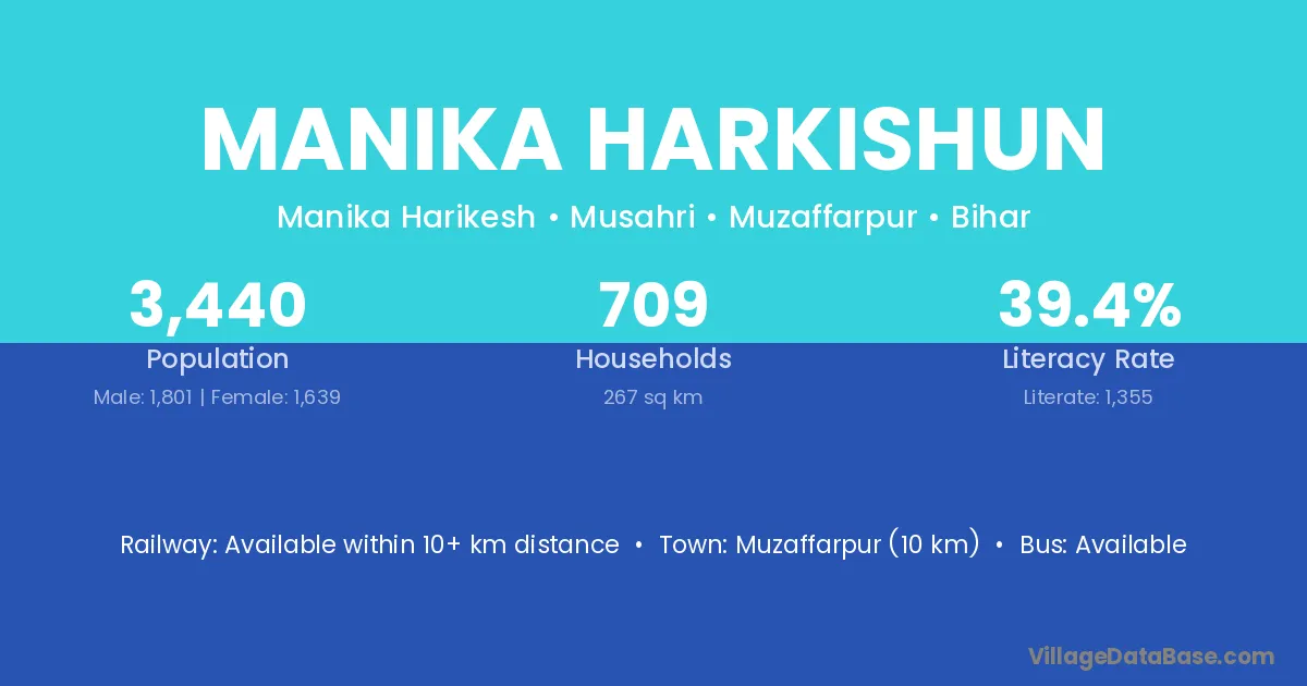 Muzaffarpur (10 km) is the nearest town to Manika Harkishun village for major economic activities and is located approximately 10 km away.