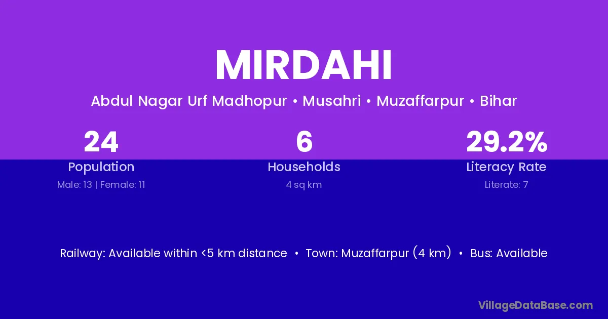 Muzaffarpur (4 km) is the nearest town to Mirdahi village for major economic activities and is located approximately 4 km away.