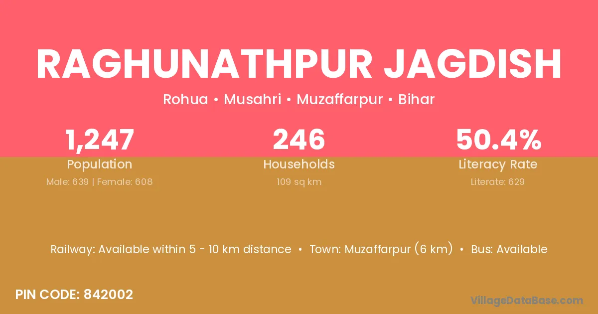 Raghunathpur Jagdish village has a total population of 1,247 people, of which 639 are males and 608 are females.