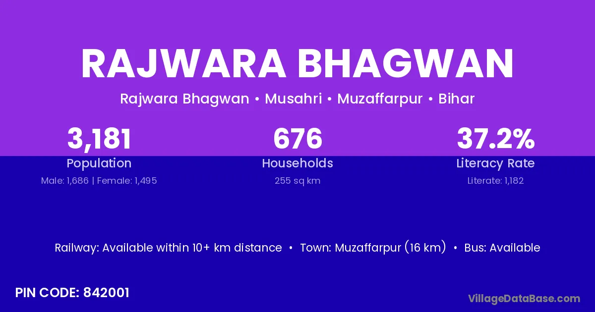 Muzaffarpur (16 km) is the nearest town to Rajwara Bhagwan village for major economic activities and is located approximately 16 km away.