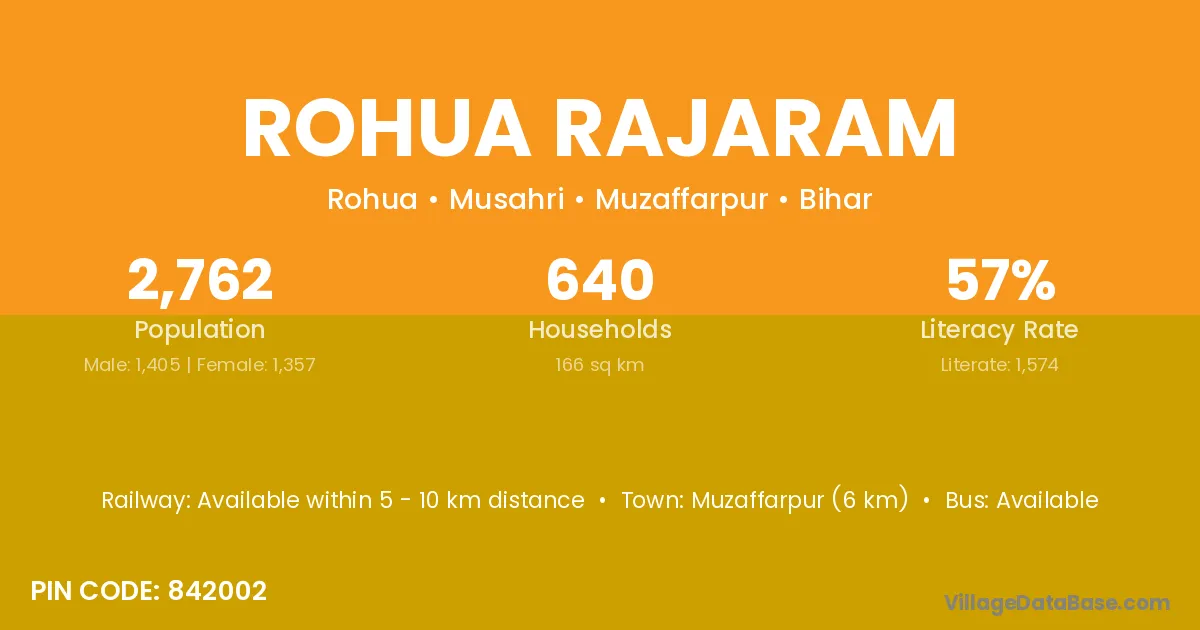 Muzaffarpur (6 km) is the nearest town to Rohua Rajaram village for major economic activities and is located approximately 6 km away.