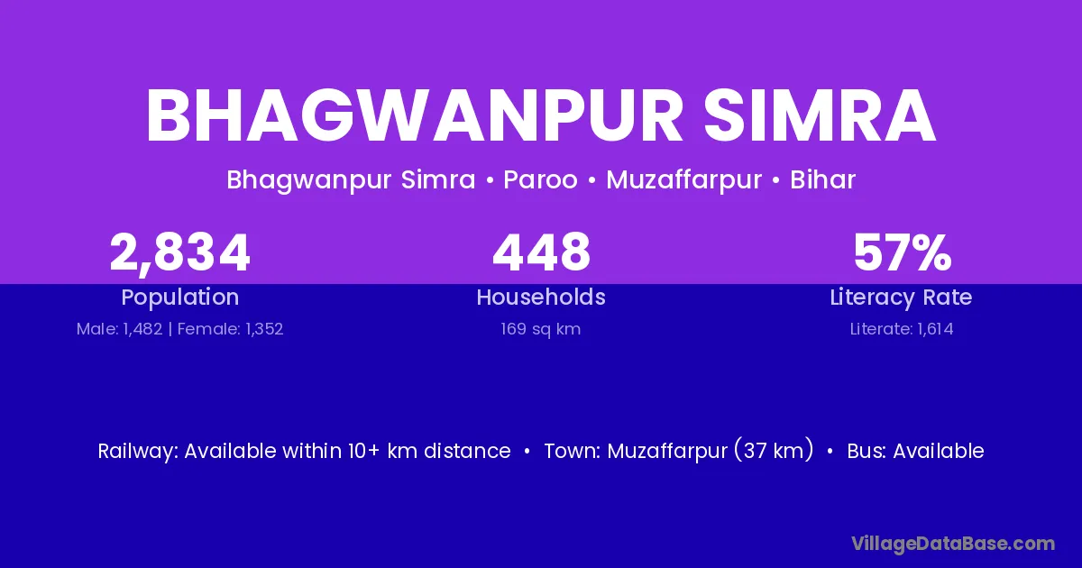 Muzaffarpur (37 km) is the nearest town to Bhagwanpur Simra village for major economic activities and is located approximately 37 km away.