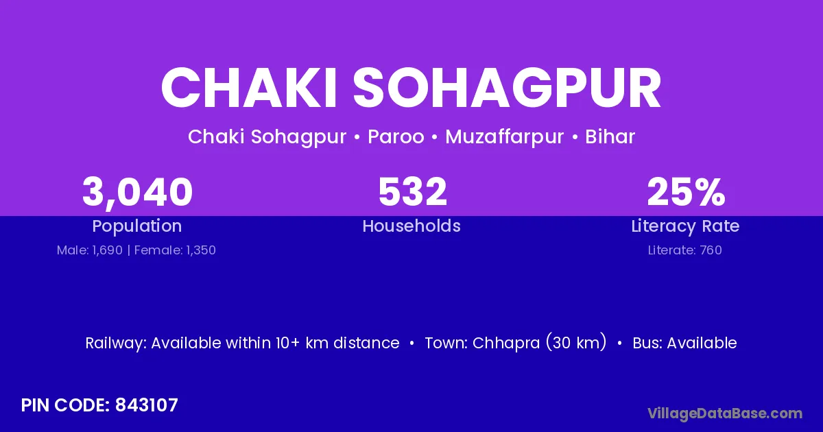 Chhapra (30 km) is the nearest town to Chaki Sohagpur village for major economic activities and is located approximately 30 km away.