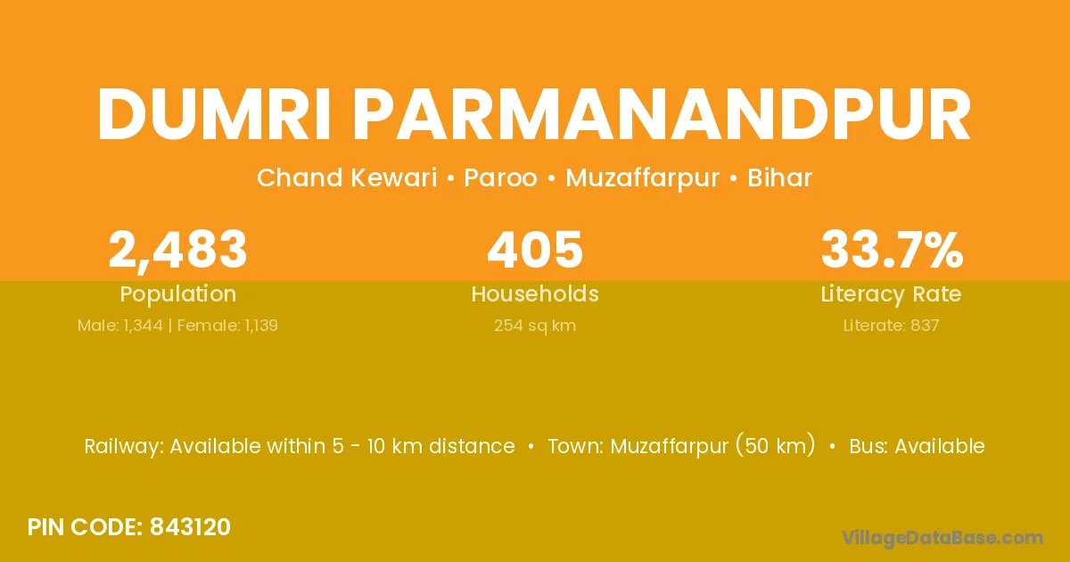 Muzaffarpur (50 km) is the nearest town to Dumri Parmanandpur village for major economic activities and is located approximately 50 km away.