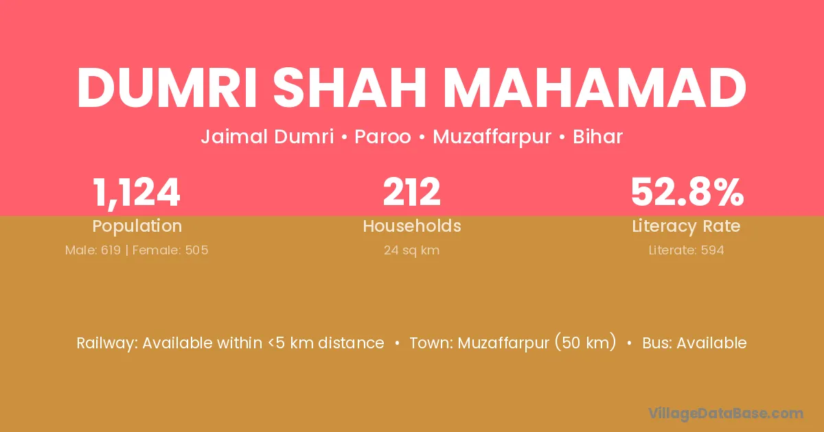 Muzaffarpur (50 km) is the nearest town to Dumri Shah Mahamad village for major economic activities and is located approximately 50 km away.